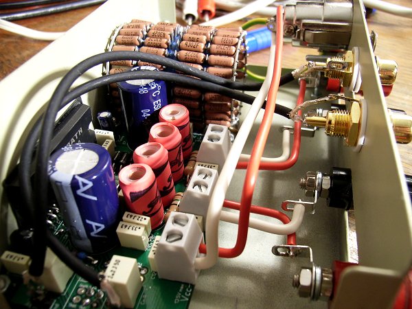 ... and back. Grounding issues: The amp PCB has its own grounding scheme and I have left it as it is. The PCB ground is not connected to the case, and the RCA and speaker-cable posts are isolated from the case. The mains ground is directly connected to the PSU case (safety earth). One wire of the power-supply connection (red cable) used for the connection of this ground to the amp. This wire directly connects the cases of the amp and the PSU (and hence the amp case is indirectly connected to mains earth this way). This connection is important. The background noise is considerably reduced and touching the case does not lead to any hum. Before I had this connection I could hear a distinct hum when I touched the case of the amp. |